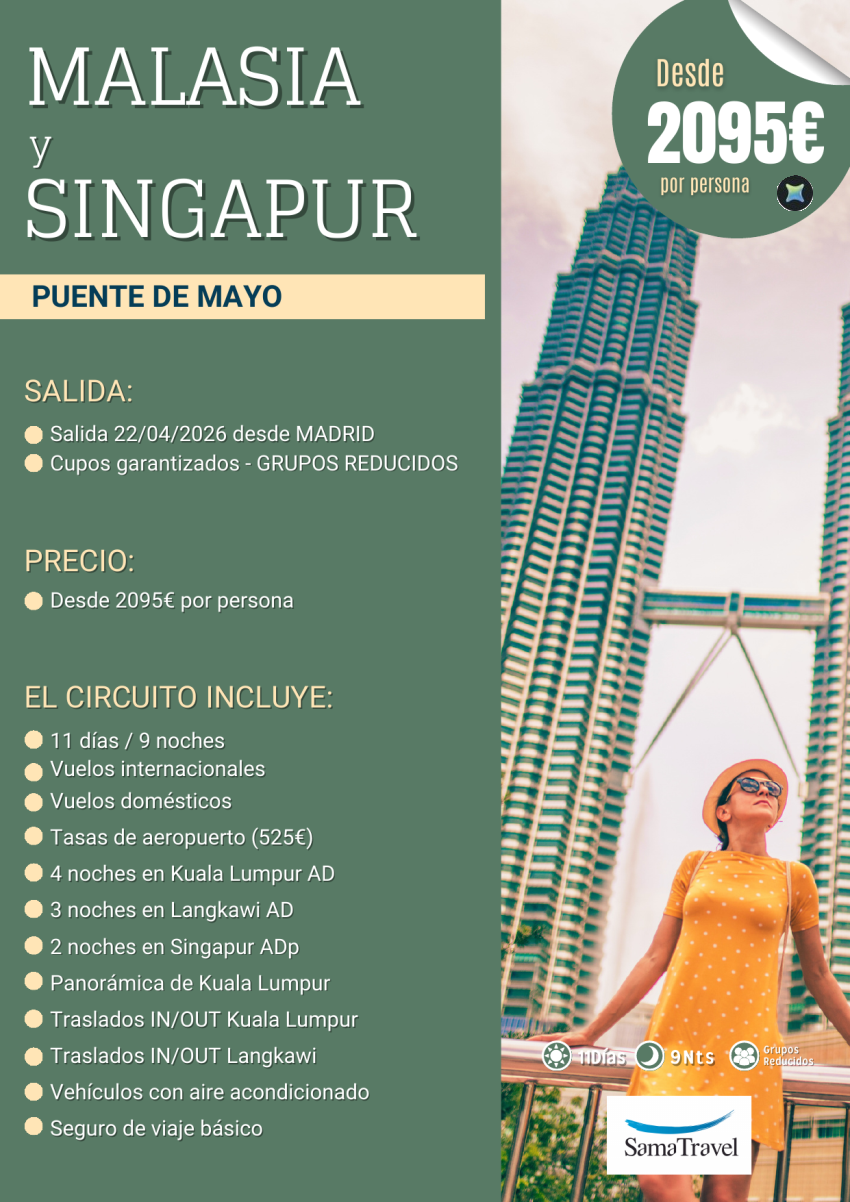 "Malasia y Singapur": P.Mayo Circuito 11 días visitas y playa 22ABR [Cupos y precios Garantizados]*Desde 2095€